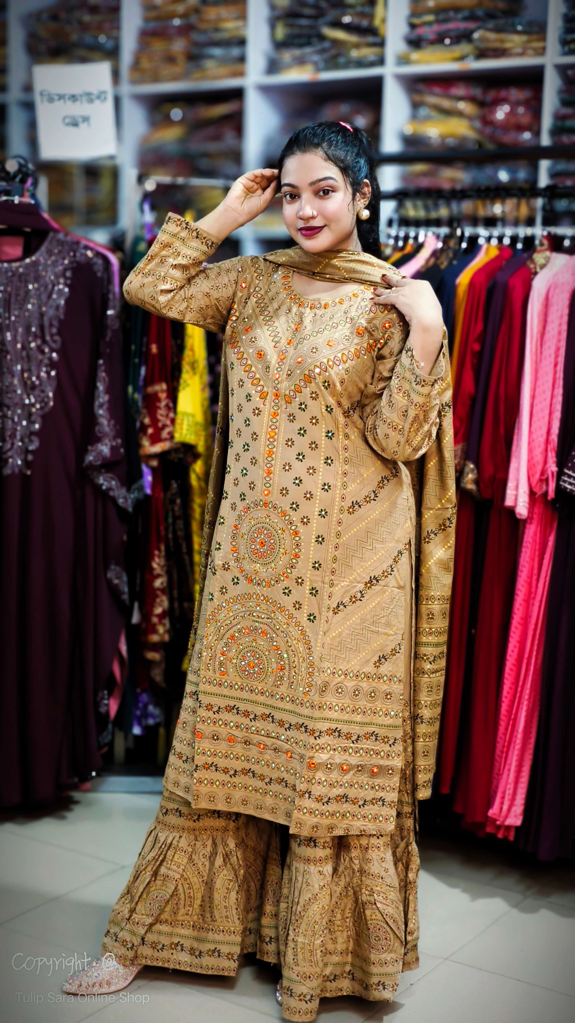 • অল ওভার স্ক্রিন প্রিন্ট এবং অল বডি মিরর এমব্রয়ডারি ও স্টোন ওয়ার্ক করা।
